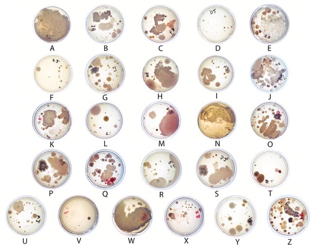 Figura 1. Placas com microrganismos originários de livros da biblioteca que versam sobre artistas de A à Z.