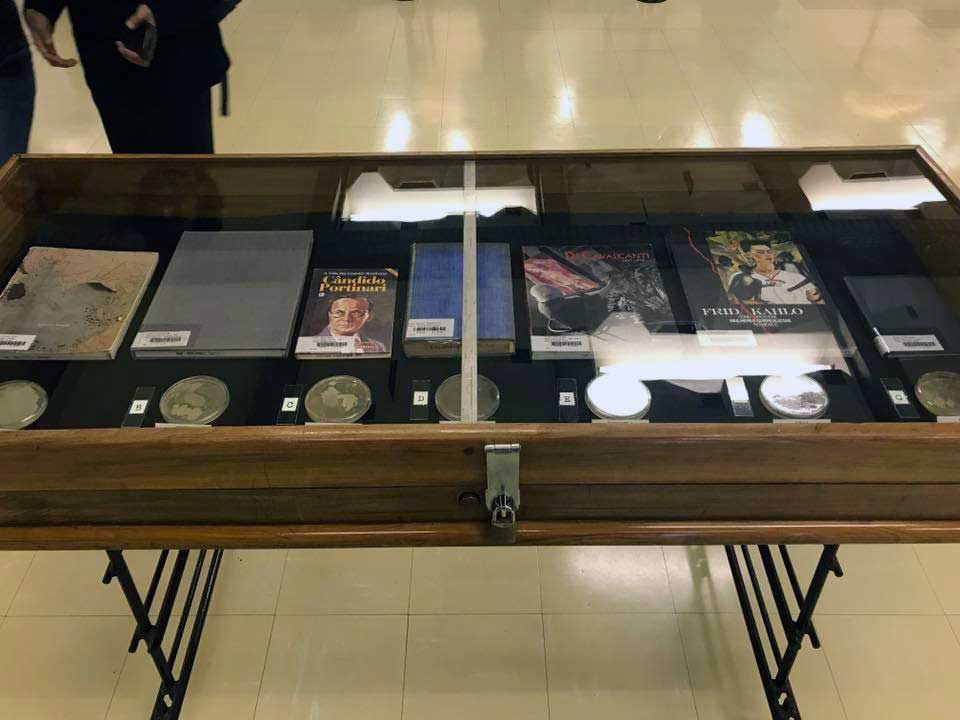 Figura 2. Livro exposto com sua respectiva colônia de microrganismos crescidos (esquerda); expositor com os livros e placas contendo microrganismos de A à G (direita).