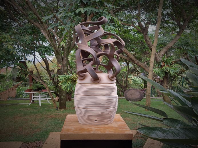 Figura 3. Simbiose #9, Cerâmica 1280 ºC, 40 x 24 x 18 cm, 2023 (esquerda). Habitáveis #1, Cerâmica, 45 x 30 x 30 cm, 2018 (direita).