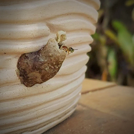 Foi nos últimos seis anos morando em zona rural de Brumadinho, parte deles no bioma de transição entre Mata Atlântica e Cerrado que o artista desenvolveu as primeiras esculturas cerâmicas para serem ocupadas por abelhas. A princípio, não houve interações significativas entre as abelhas nativas, mas após seis meses da primeira inserção em meio ambiente, as abelhas começaram a ocupar pouco a pouco cada trabalho. As abelhas chamadas de “campeiras” visitam as esculturas e começam a preparar o ambiente interno da escultura. O volume de abelhas se intensifica ao longo dos dias e cerca de uma semana depois se observa centenas de indivíduos entrando na escultura (figura 3).