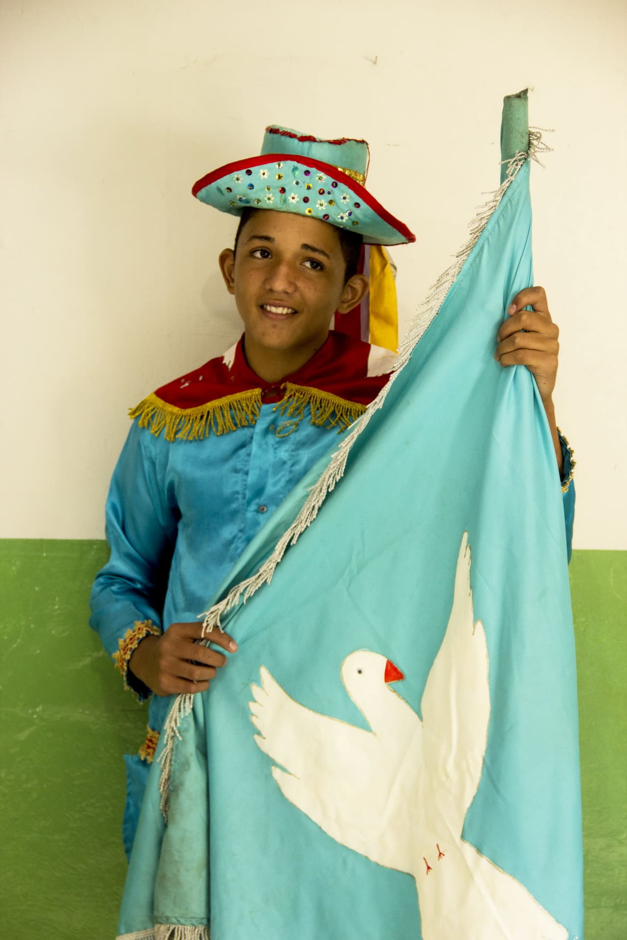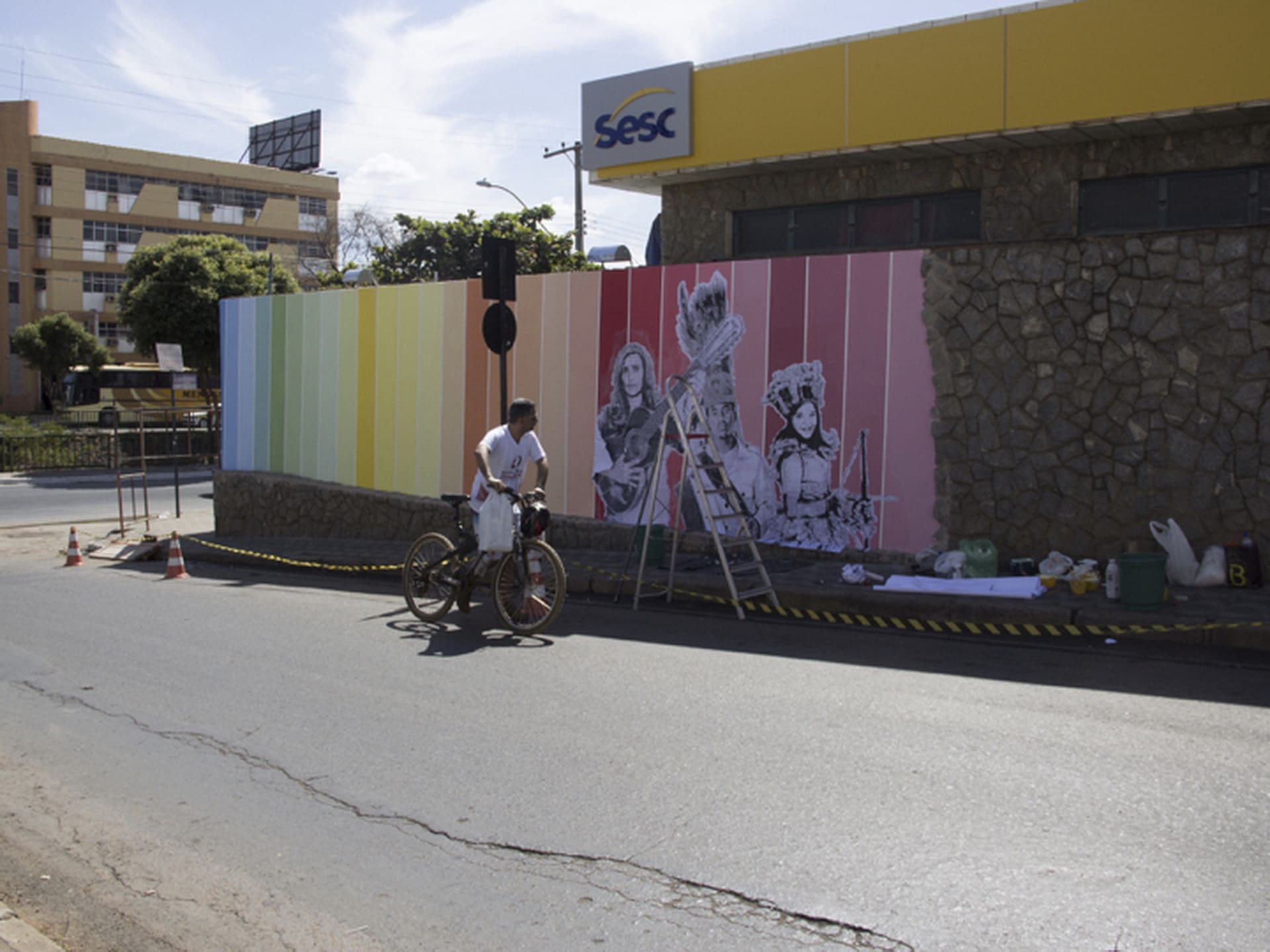 “Lugar de Pouso” é uma intervenção de grande escala que transforma um muro da cidade em uma homenagem à cultura popular e à sabedoria ancestral. Realizado para o Projeto Parede do Sesc em Montes Claros, o trabalho é fruto de um profundo processo de imersão e diálogo do artista com os mestres e integrantes das guardas de Congado da cidade.
